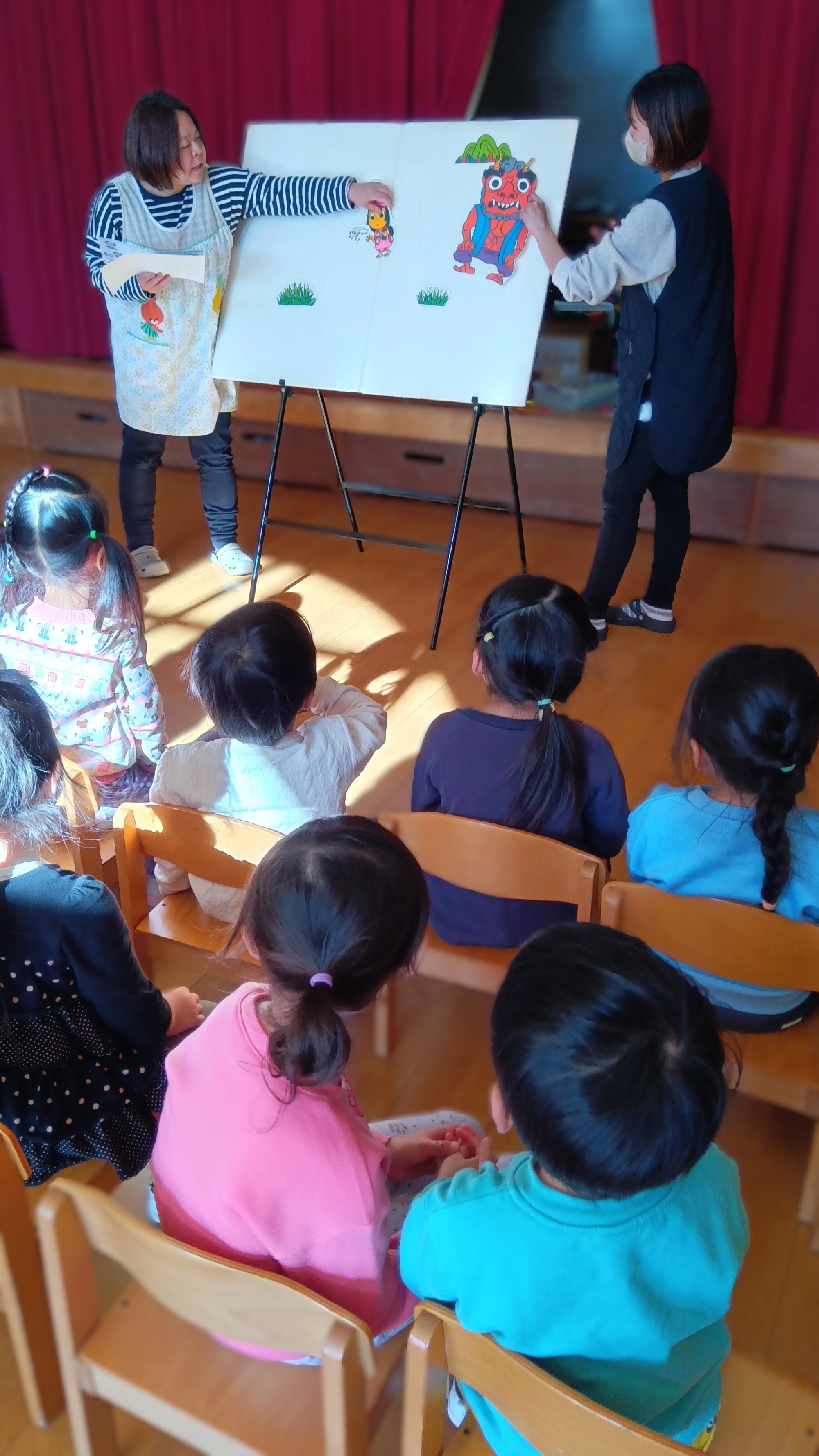 さらにどうして豆をまくようになったのかパネルシアターで『せつぶん』のお話もみんなで観ました。