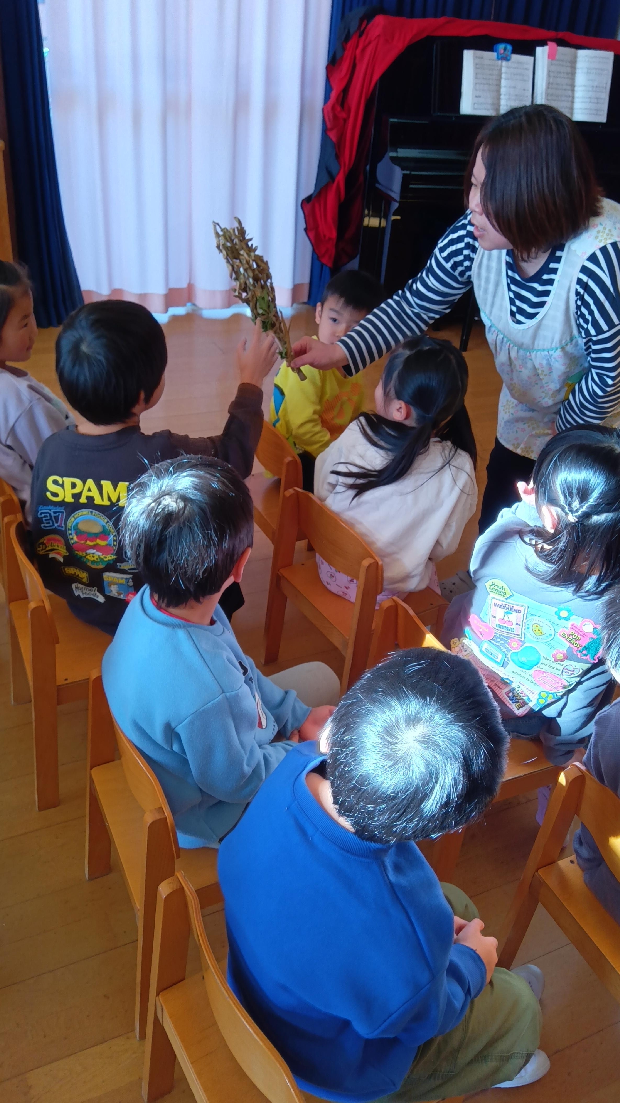 そして鬼退治に欠かせないのが炒った豆ですが、今日は日本で昔から鬼を退治してくれる植物としてヒイラギの葉を保育士が用意してくれました!